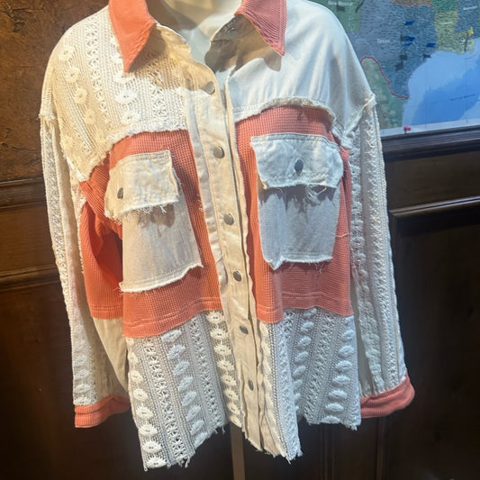 NWOT SIZE OS POL Pink and White Crochet Button Down Shirt