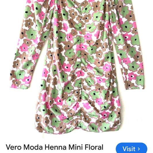 SIZE M Vero Moda Pink and Green Ruched Bodycon Dress with Puff Sleeves