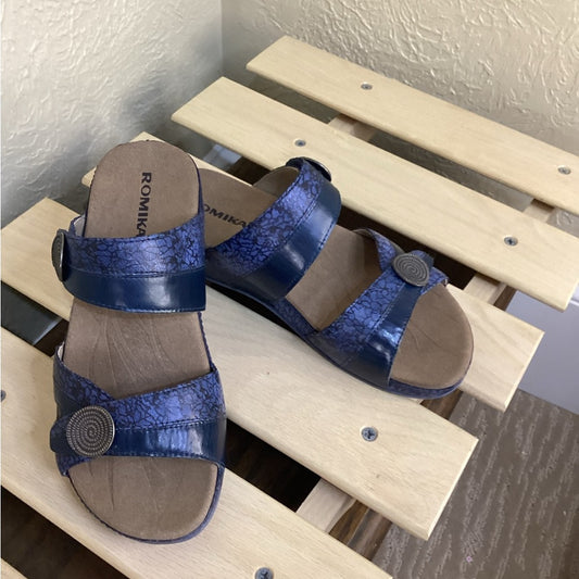 New Size 6.5 Romika Blue Sandals with Wide Straps and Metallic Embellishment