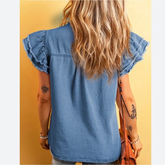 NWT SIZE XL BiBi Blue Button Down Top with Flutter Sleeves and Ruffled Accents