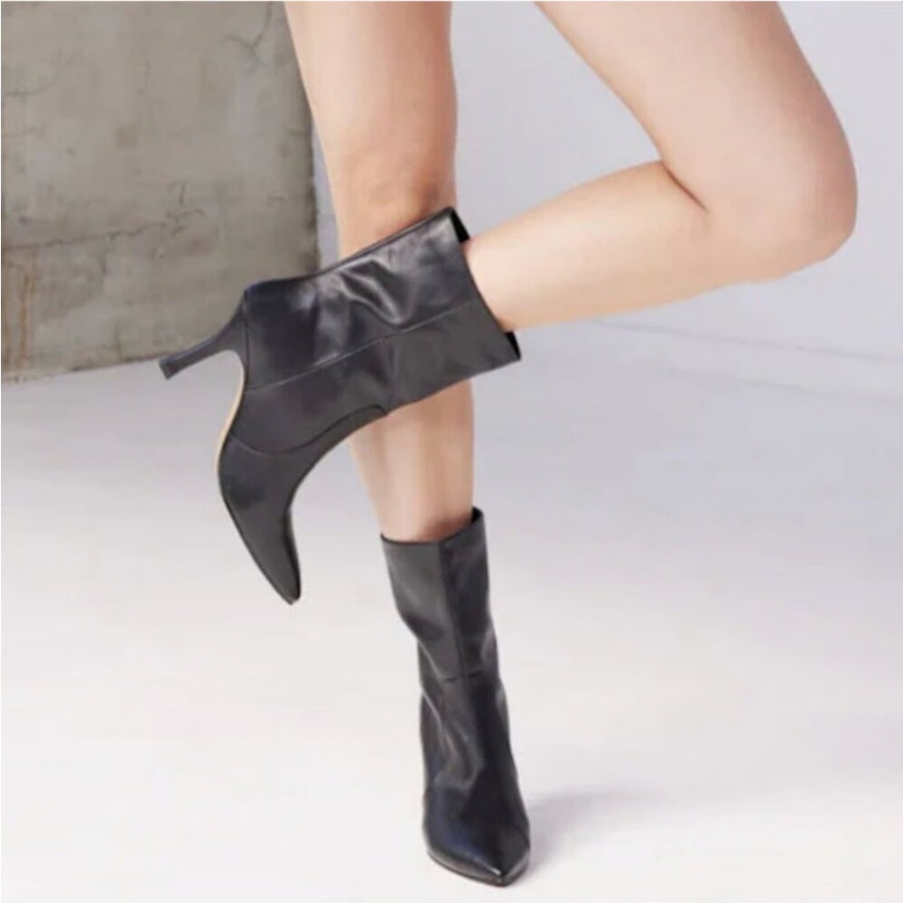 These black heeled boots feature a sleek, sock-like design that hugs the ankle for a modern and minimalist look. Crafted from a solid black material, they boast a pointed toe and a medium to high stiletto heel, offering an elegant silhouette perfect for any occasion.