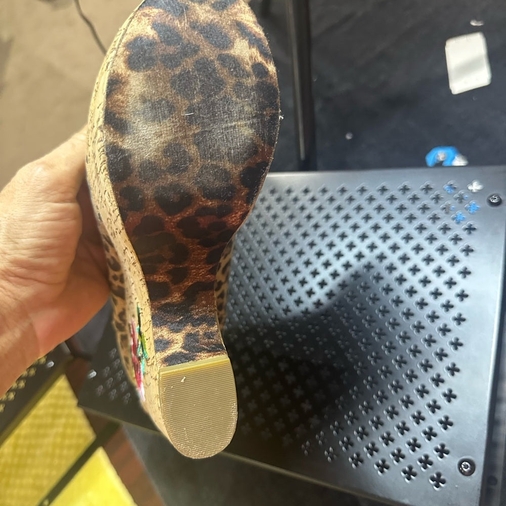 Step up your fashion game with Betsey Johnson's brown wedges, showcasing a bold animal print. These slip-on shoes feature a high platform and cork wedge heel, combining style with comfort for a dramatic look.