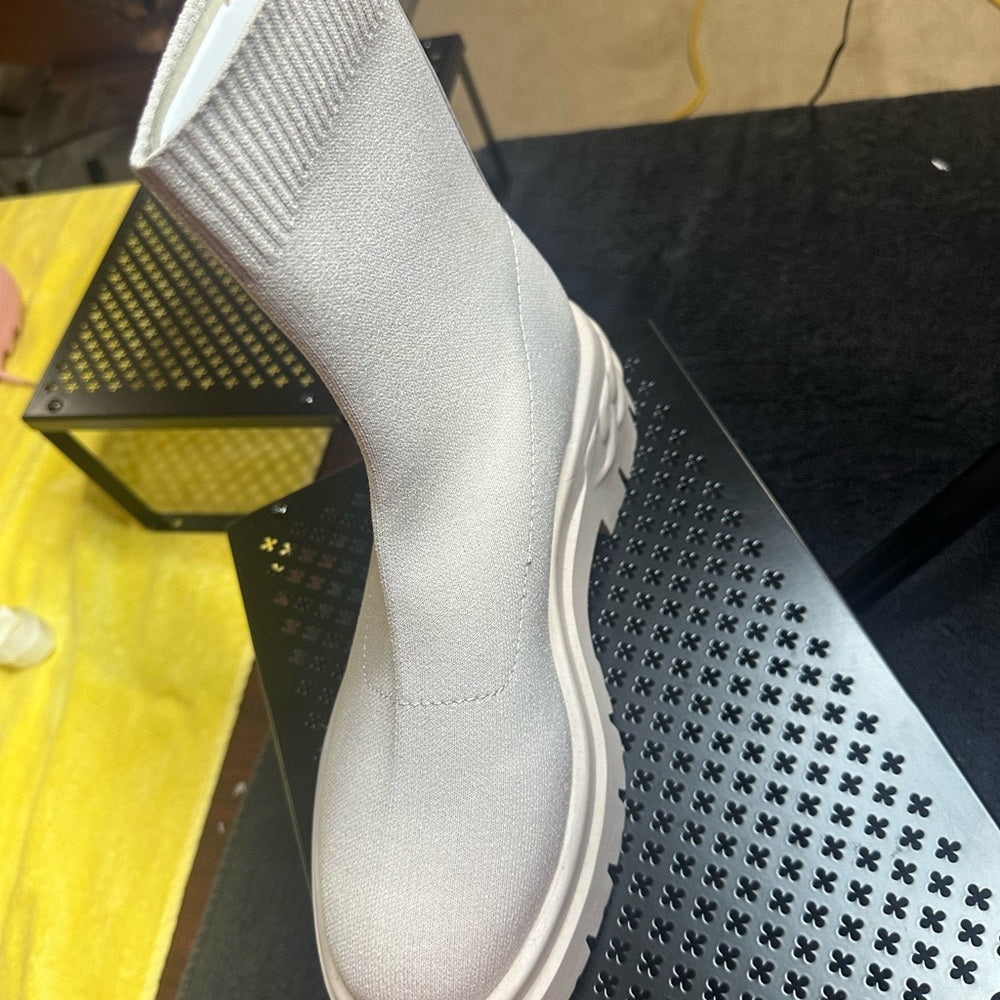 Step into style with Aldo's cream ankle booties, showcasing a chic knit sock-like upper and a bold chunky sole. These pull-on boots offer a seamless, minimalist design perfect for any fashion-forward wardrobe.