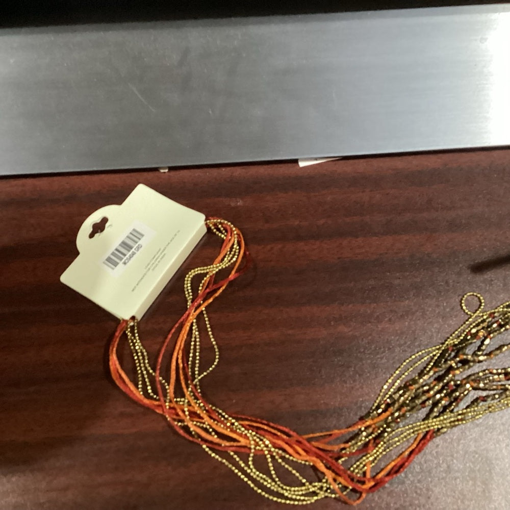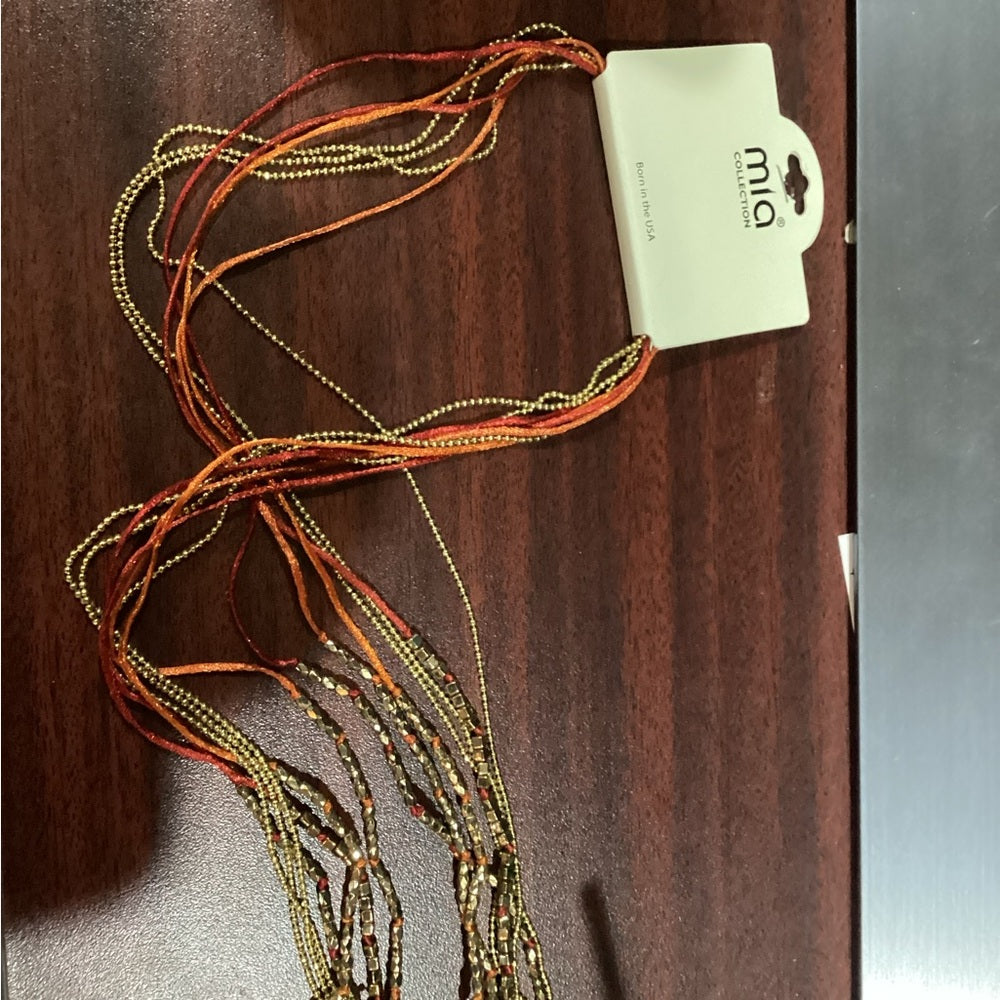 The MIA necklace showcases a captivating blend of gold and orange hues, featuring multiple delicate strands that create a cascading, layered effect. The intricate design combines thin gold chains with vibrant orange elements, offering a bohemian flair that enhances any neckline. Perfect for adding a touch of elegance and color to your ensemble.