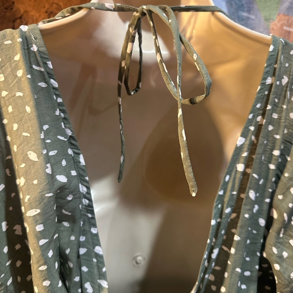 Elevate your wardrobe with this chic green midi dress, adorned with delicate white accents. Perfect for any occasion, this dress offers a blend of style and comfort.
