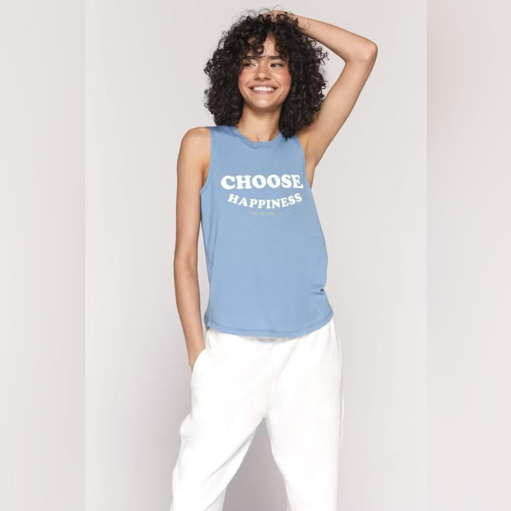 Embrace joy with this sky blue muscle tee. Features bold 'Choose Happiness' slogan. Perfect for casual style.