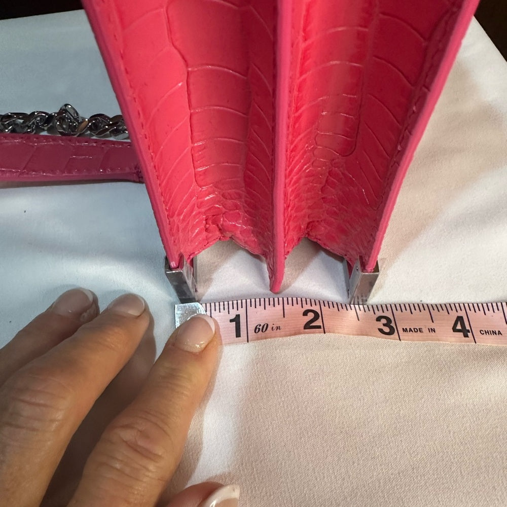 Vibrant pink bag with croc texture. Features a sleek chain strap and secure clasp.