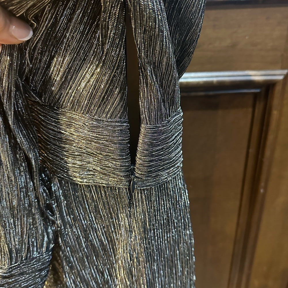 Elegant metallic dress by The Kooples. Long sleeves with a chic wrap style.