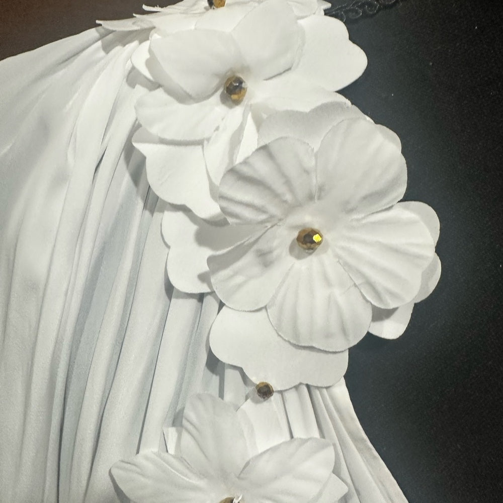 Sophisticated white blouse featuring floral embellishments. V-neckline and long sleeves with flared cuffs. Ideal for elegant occasions.