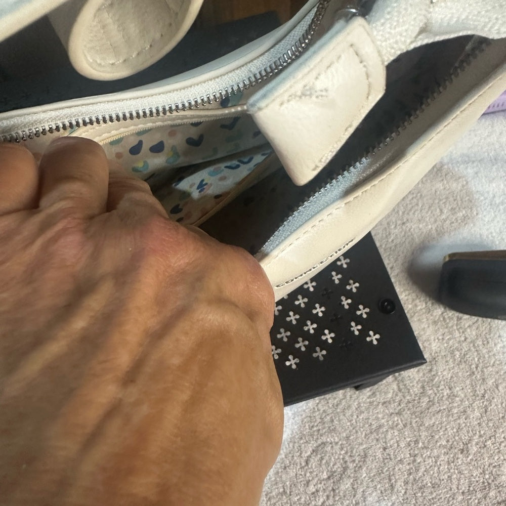 Elegant cream shoulder bag with a modern design. Includes a stylish round pouch.