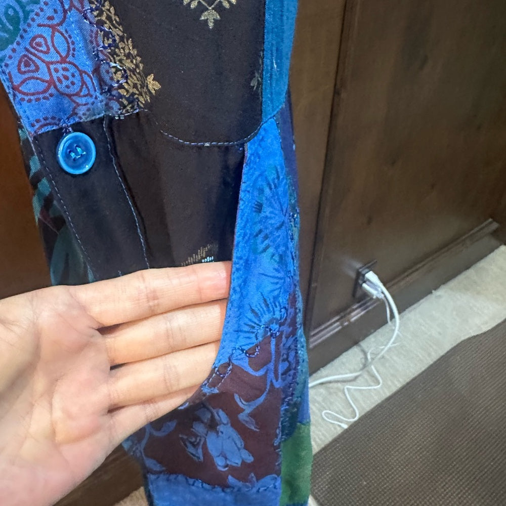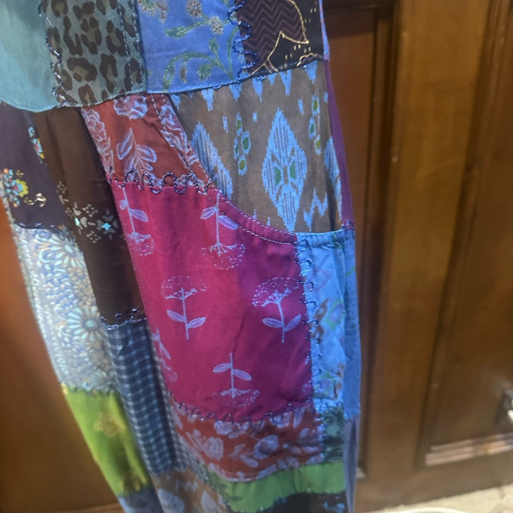 Colorful patchwork design. Sleeveless with buttoned straps. Ideal for casual wear.