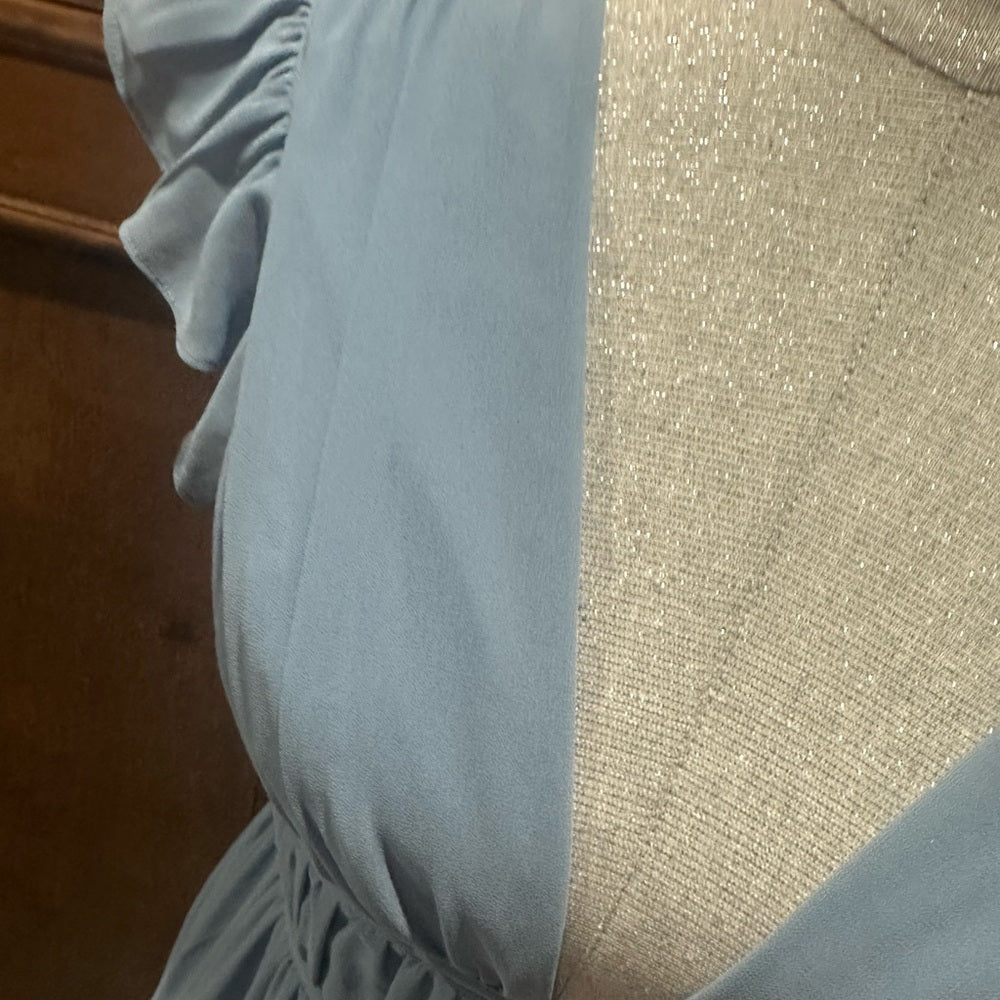 Graceful blue maxi with V-neck and flutter sleeves. Features a stylish slit. Ideal for special events.