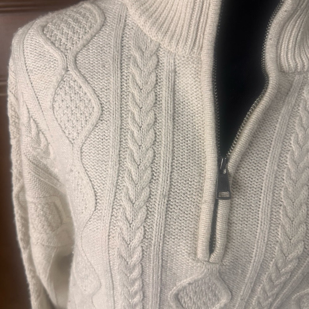 Elegant off-white turtleneck by Splendid. Features a cozy cable knit design. Perfect for chilly days.
