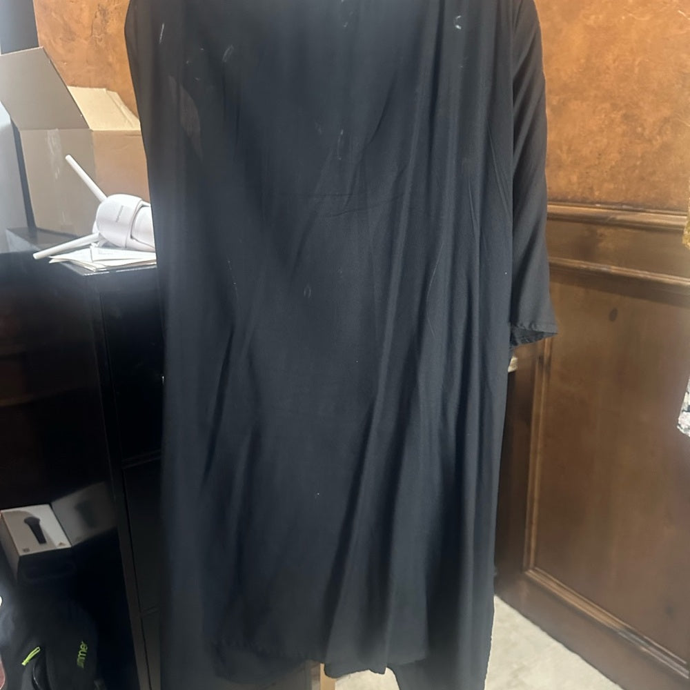 This elegant black and white coverup from Swimsuits For All is designed for a stylish beach day. Crafted from a lightweight, flowy fabric, it features a V-shaped neckline with decorative trim for added flair. Perfect for layering over your swimwear, it combines comfort with a touch of sophistication.