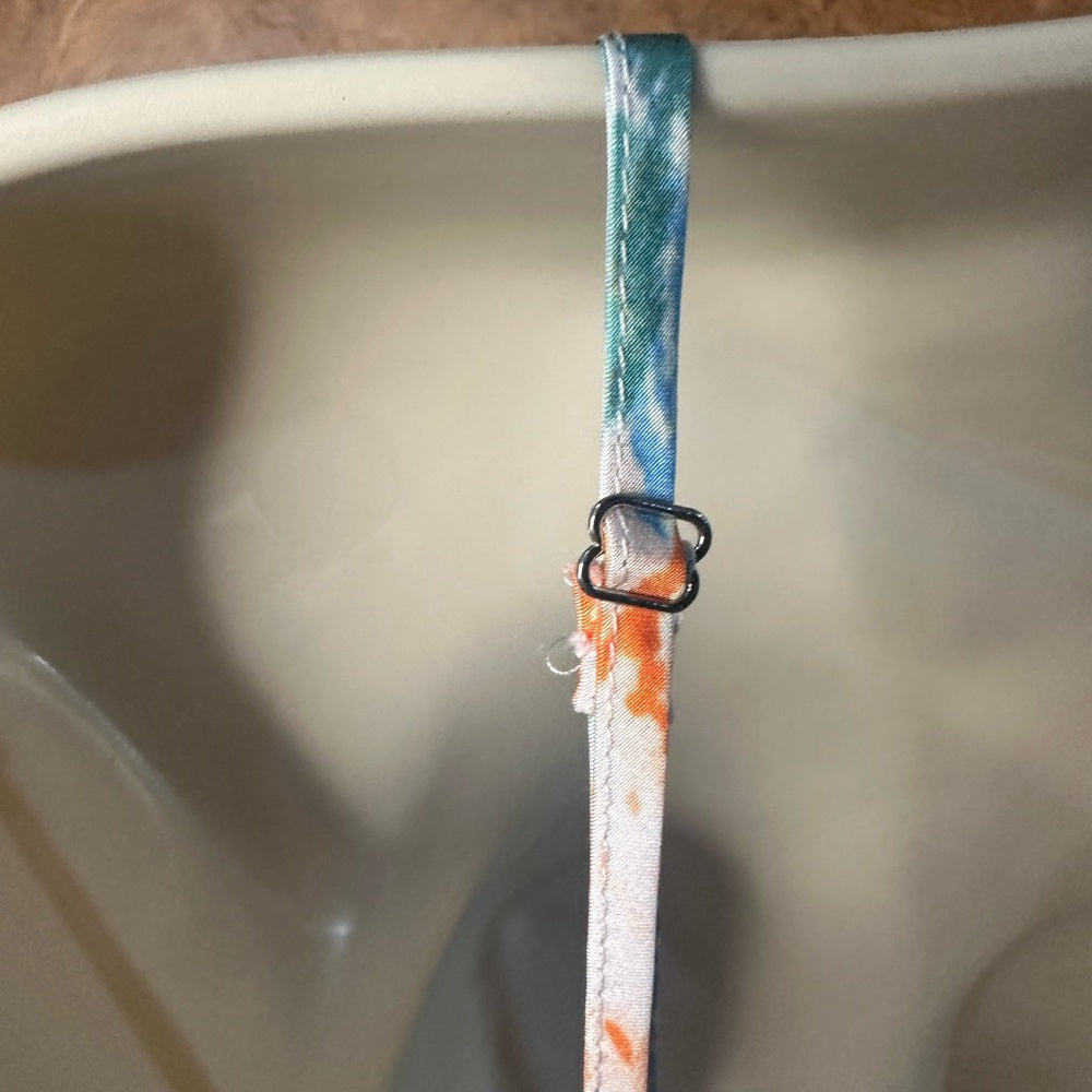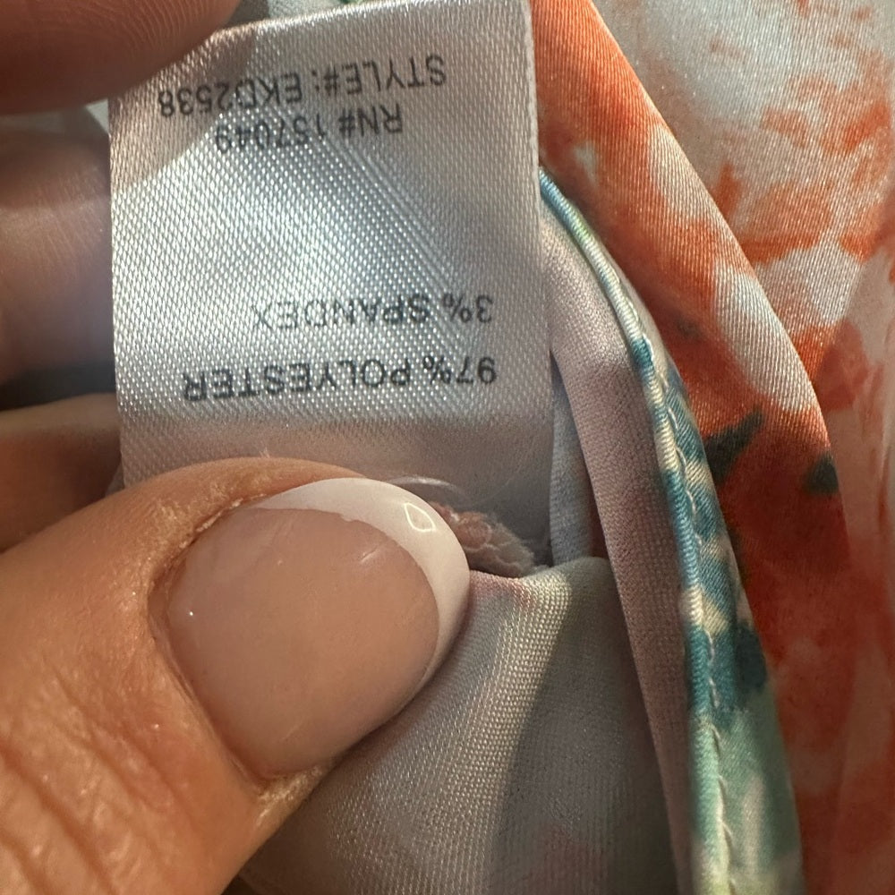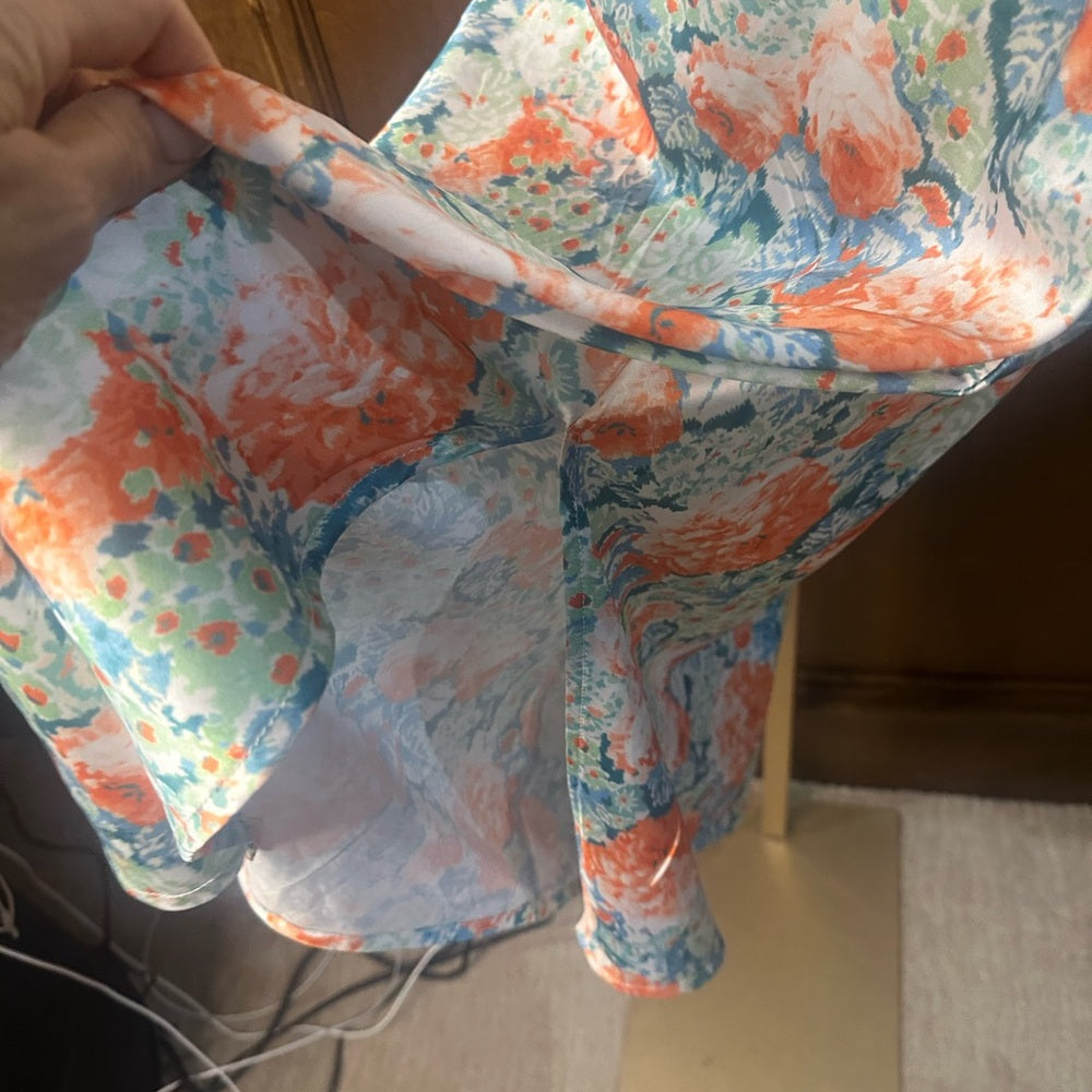 Embrace elegance with this beautiful floral wrap midi dress. Featuring a stunning mix of orange and blue hues, it's perfect for any occasion. The delicate spaghetti straps add a touch of sophistication.