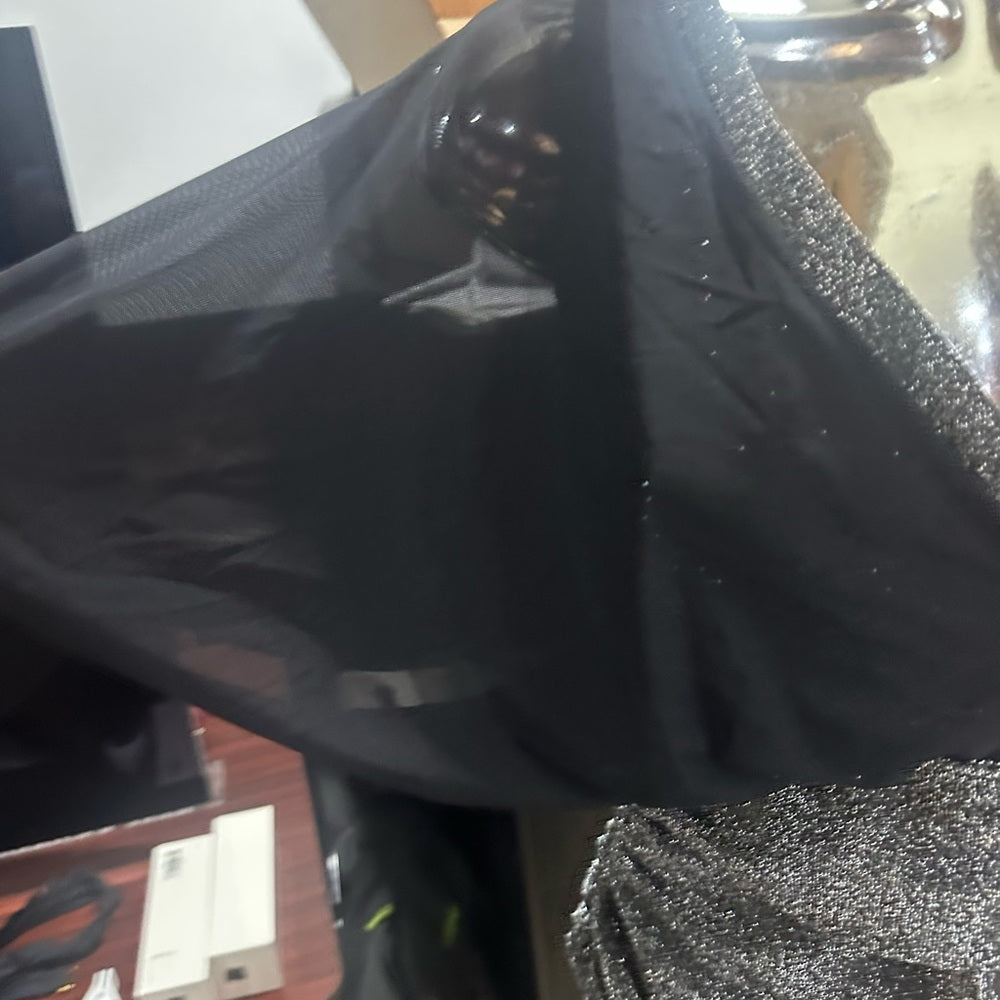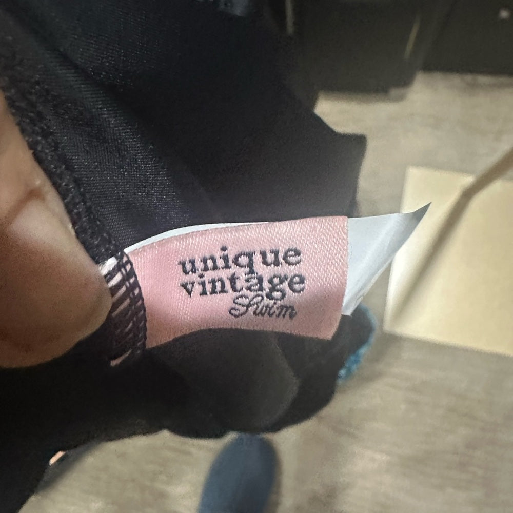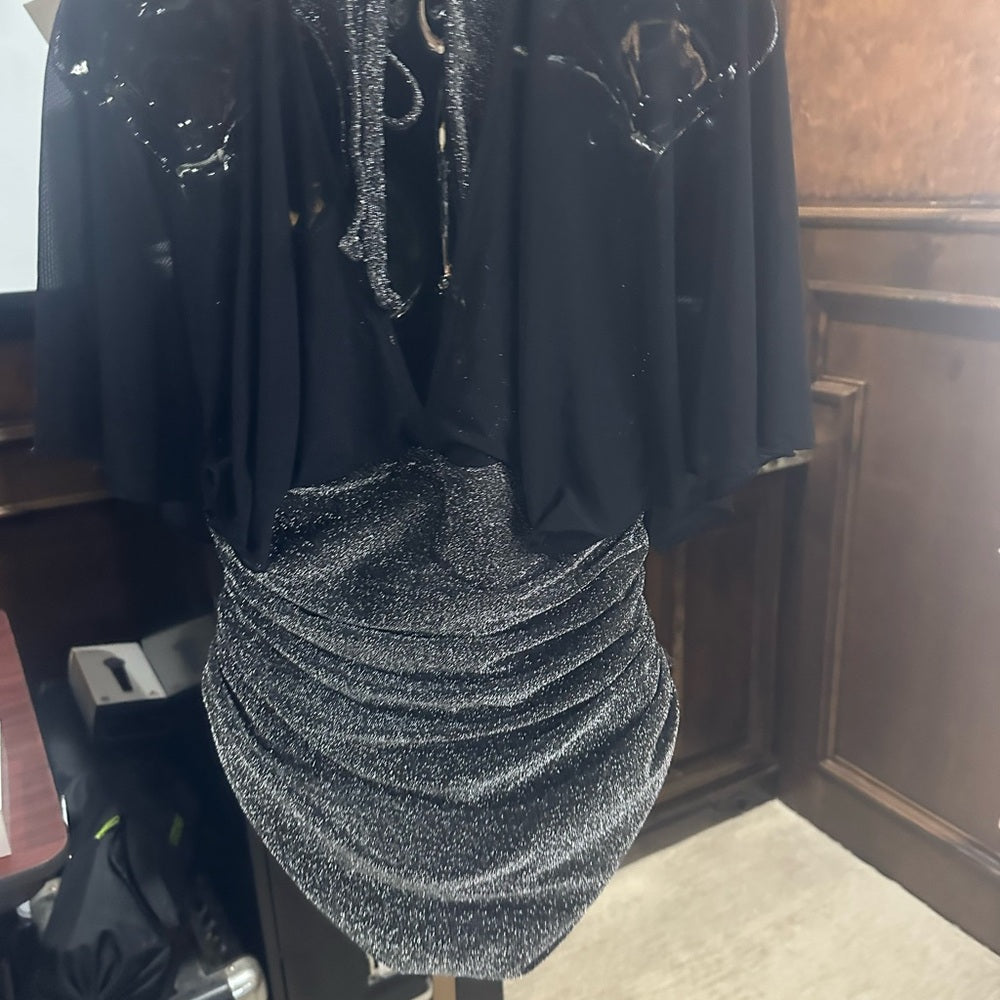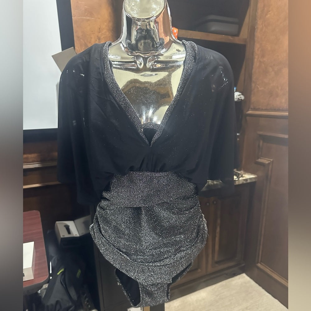 Elegant black one-piece with shimmering silver accents. Features a stylish overlay. Perfect for a chic beach look.