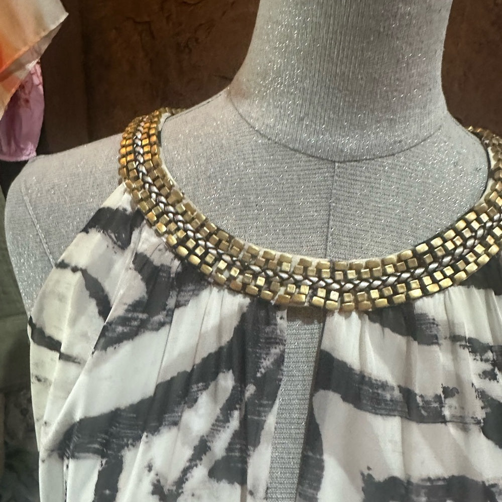 Step into resort sophistication with this Vince Camuto creation, showcasing a bold black and white pattern. The sleeveless halter neckline and flowing maxi design offer a chic and breezy style, ideal for a luxurious escape.